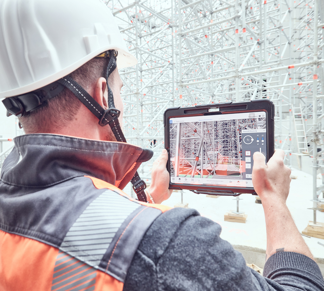 - Digital unterstützte Montage: punktgenaues Einmessen der Traggerüstkonstruktion mit SIM2Field sowie Einsatz der SIM2Field XR App beim anschließenden Weiterbau