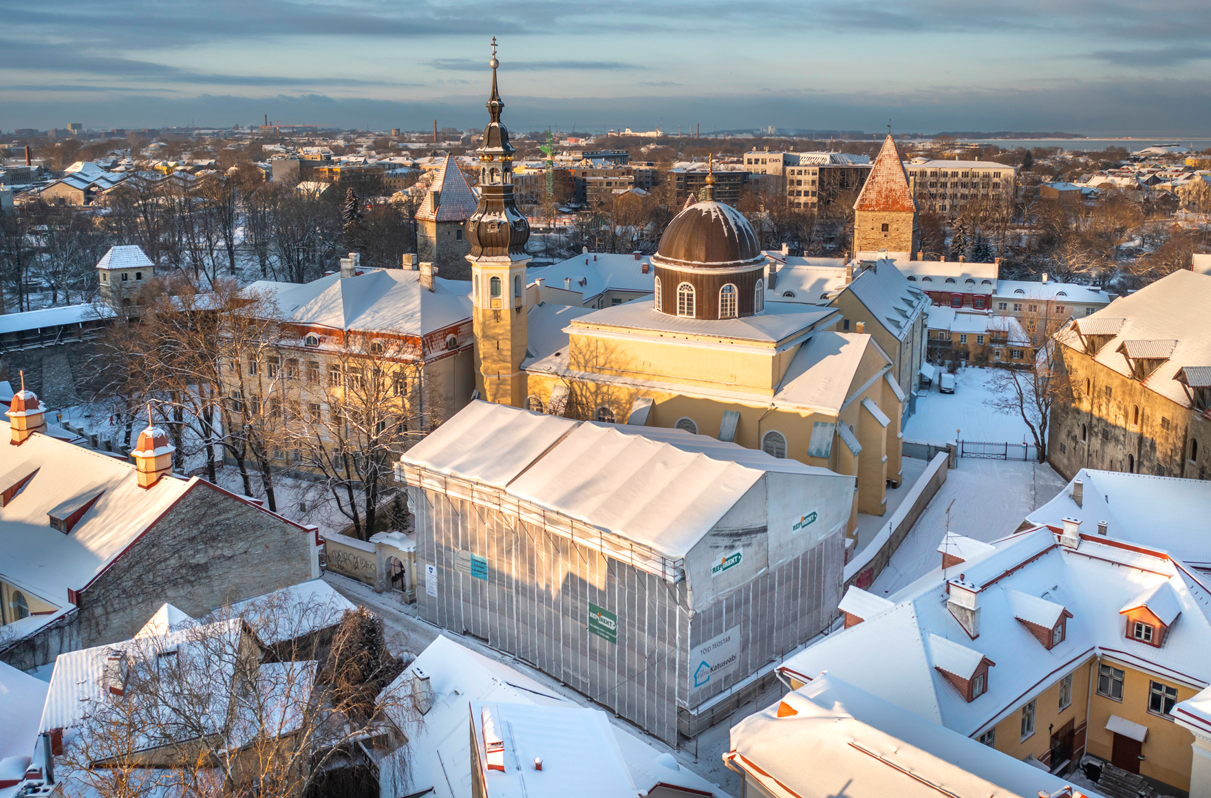 When old buildings have to be renovated in historic cities, simple work scaffolding is usually not enough. Instead, the site also has to be protected and aesthetics are crucial. A current example: The renovation of the Church of the Transfiguration of Our Lord in Tallinn (Estonia) during the winter months. The task called for flexible facade scaffolding because of the curved shape of this medieval abbey church with a Baroque iconostasis dating back nearly 300 years. What is more, the site had to be enclosed to make it possible to work independently of weather conditions and also to protect passers-by: The most economical solution? A combination of Allround Scaffolding, Keder Roof XL – and digital preliminary 3D planning.