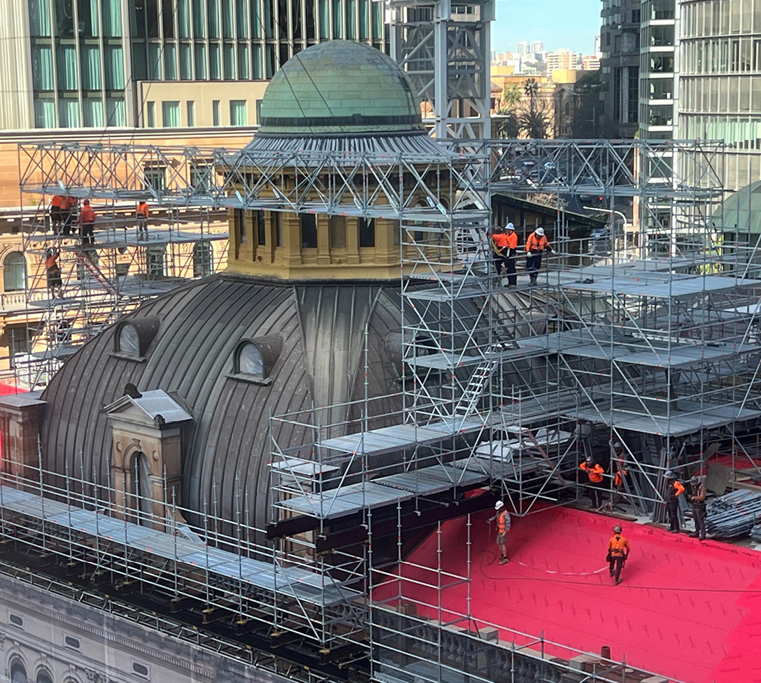 The scaffolding for the heritage-listed Lands Department Building in Sydney, Australia, with its splendid facade and copper dome – also known as the “onion” – meant a few special challenges for the local scaffolding erectors: firstly, several components had to be bridged. And secondly, the overall weight of some 5,000 square metres of work scaffolding was an important factor, as the part of the area around the building has tunnels underneath it. The solution: Allround Scaffolding with Lightweight technology. With its lightweight yet strong components, it not only ensured a material-saving structure that was also optimally adapted to the building’s geometry, but also offered matching extension parts to meet all on-site requirements. A solution with a system.